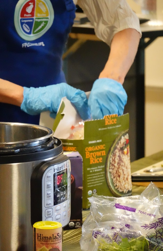 The quick part of this recipe is that your use frozen Asian vegetables and brown rice in the refrigerated section at Trader Joe’s. Amanda also told us about the frozen ginger and garlic at Trader Joe’s . You only need a small jar of Thai red or green curry paste. I love chickpeas or garbanzo beans. The rest of the ingredients included a can of coconut milk, diced tomatoes, and some cilantro.