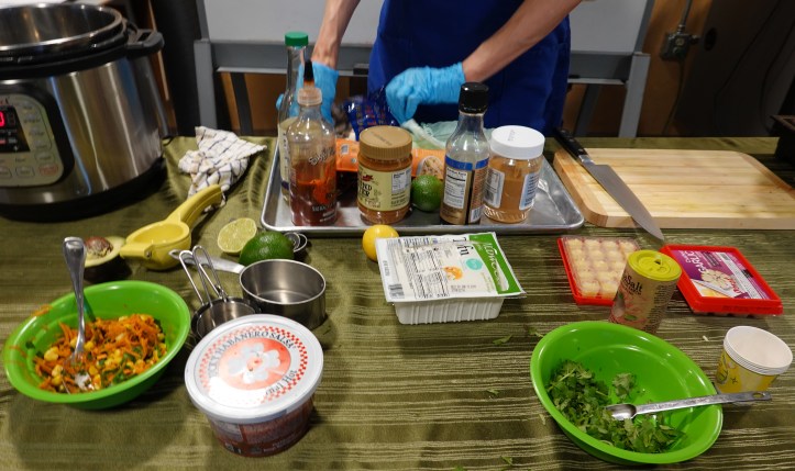 For this class, Amanda made: vegetable and chickpea Thai curry, quick slaw, a sweet potato quesadilla, a black bean and mango bowl or tacos and Dan Dan noodles. She had made fruit balls for desert.