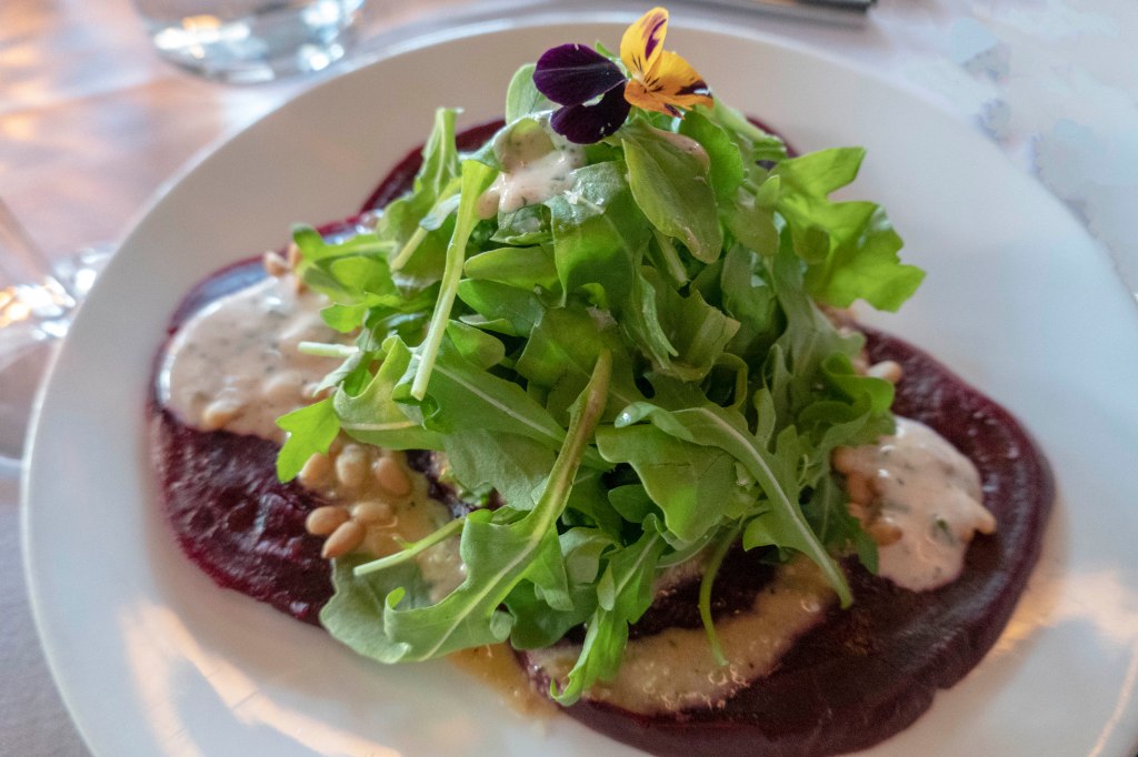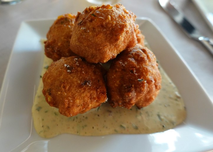 We went with the small plate options. I had the pinto bean hummus with spicy pickles and crostini 10) and the sweet corn fritters, jalapeno with green goddess dip(12). The pinto bean hummus reminded me of chickpea hummus. The pickles were four thinly sliced carrots with two radish slices in the center of the hummus. there was also a little pickled cauliflower floret and a pepper slice. I had never had corn fritters but had plenty of green goddess salad dressing. This dip was entirely different(better) than any green goddess, I have ever tasted. Yum!