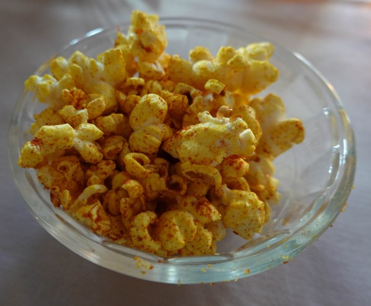 We had some friends from out of town who wanted to go to Radish and Rye. I really enjoy the Bourbon cocktails there. The food was good, too. To start, we were greeted with an amuse bouche of duck fat popcorn. It looked very pretty. (No, I didn’t eat any).