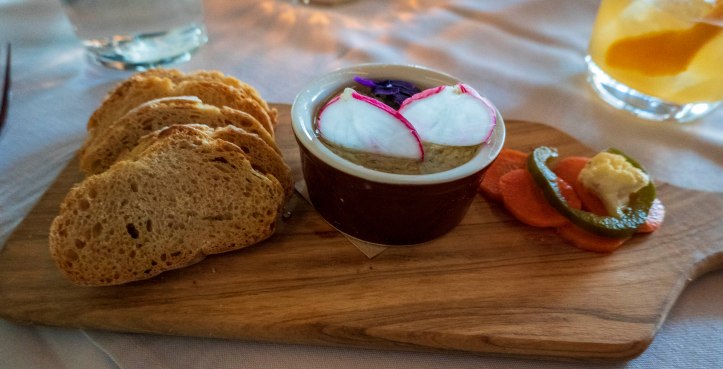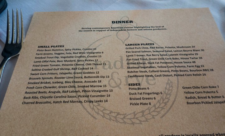 For our cocktails, we had the 505 Manhattan (12) and the seasonal shrub smash (12). I had the smash which was citrusy and refreshing. I had vaguely heard of a smash. The waitperson was kind enough to explain that it was a colonial drink. The signature cocktail list had many ingredients that I wasn’t familiar with which was good because this made this outing an adventure. In fact, the bar was very inviting.