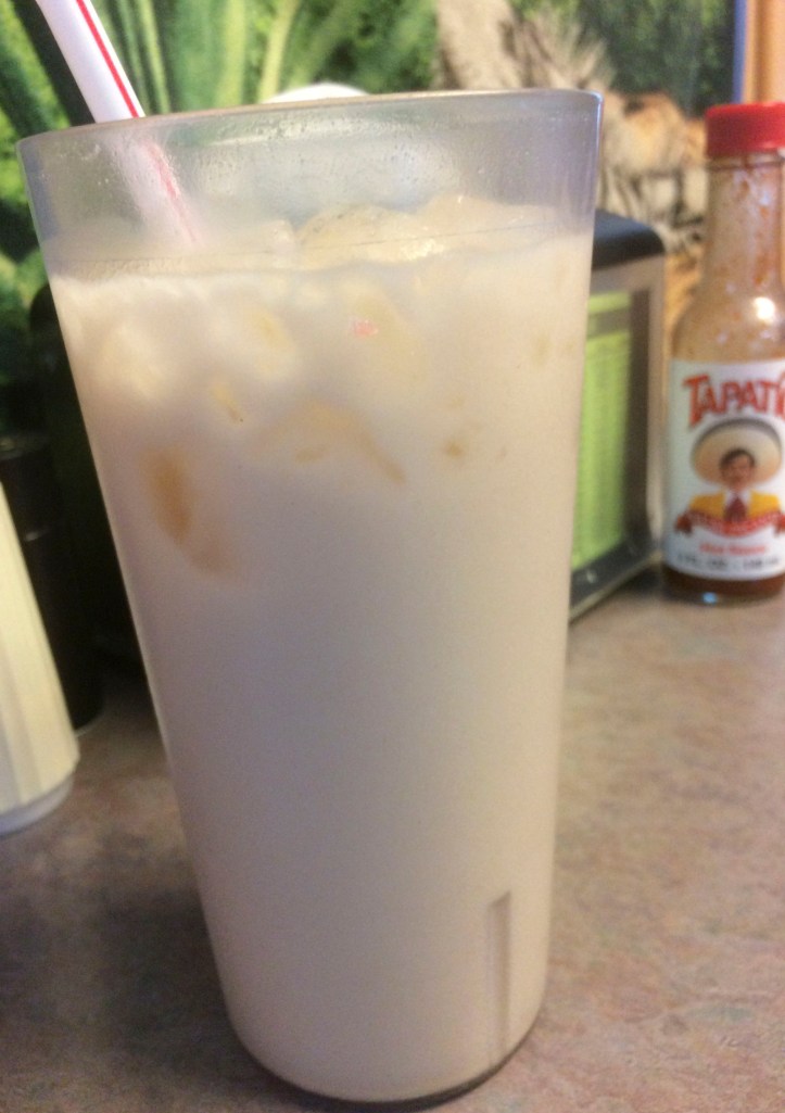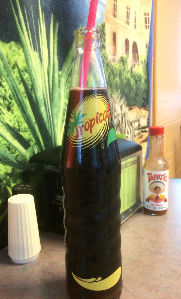 We had a loroco (a green flower bud from El Salvador) with cheese and a chile verde pupusa which was Green Chile and cheese. Pupusas are served with a tomato sauce and pickled cabbage. My better half had the delicious horchata ( a sweet rice water with cinnamon). Since they were out of pina(a pineapple agua fresca), I had the grape soda. It was delicious as well and highly carbonated. I got a very long straw for the very large bottle. Wow! I have never seen a soda bottle that tall.