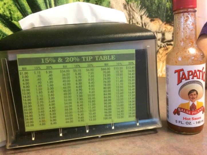 Our server was quick as was our food. I thought the tip chart on the napkin holder was a very unique idea.