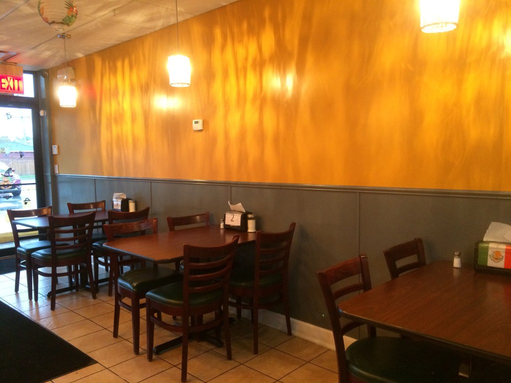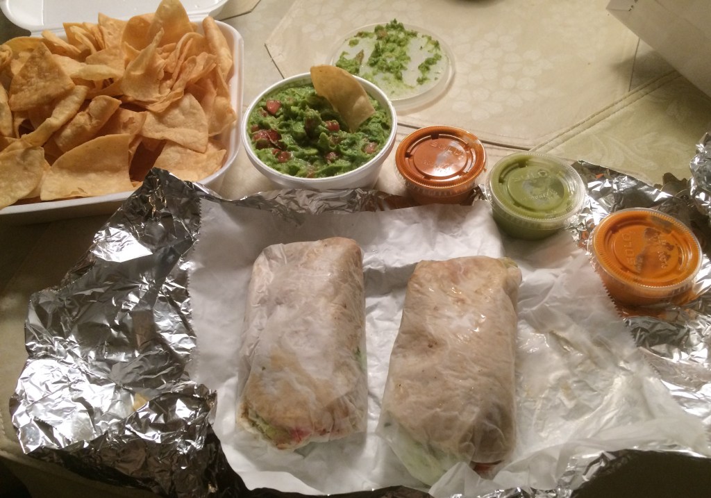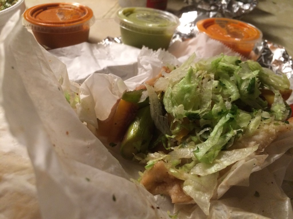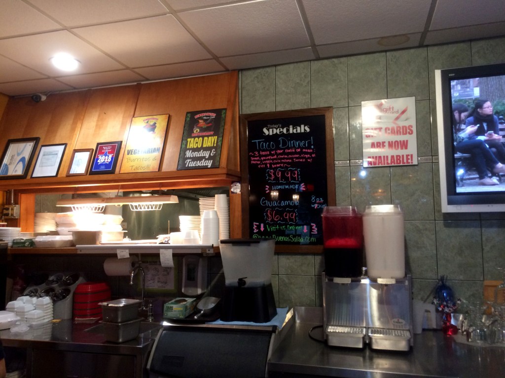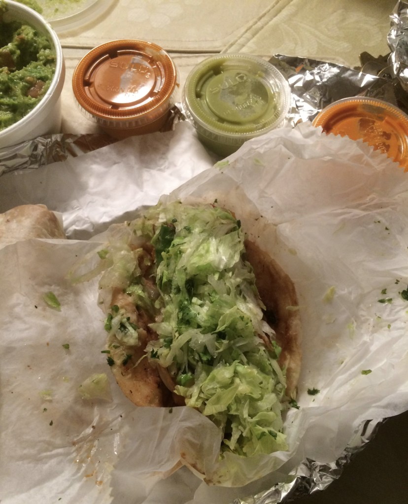 I was very surprised to find this family run restaurant by my Mom’s house. Buenas Salsas is a cute little Mexican Restaurant. Yes, they also had pupusas but they would take 20 minutes to make and I was really hungry. So I had the soft shelled veggie tacos(2 for 5.98) instead. These tacos were delicious! One of my all time favorite vegetables, asparagus, was in the veggie filling along with yellow peppers, red peppers, and onions with lots of chopped lettuce on top. I also ordered the special guacamole that had lots of tomatoes(6.99) which came with a large side of chips. I had a large horchata (a rice milk with cinnamon) (2.99)while I waited for my take out order. I thought it was especially thoughtful to get a sliced cut up lime to squeeze on my food. Since this was Buenas Salsas, I also received three different types of salsas. There was a tomatillo salsa, a medium one, and I was warned by the server that the darkest red salsa was very hot. Ok, she was correct. The reddest salsa was extremely hot. I thought it was a great idea to stick with the medium hot salsa that night. It worked for me. This made for an enjoyable dinner on a very rainy night.