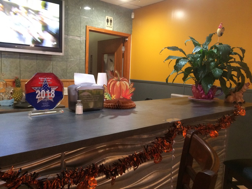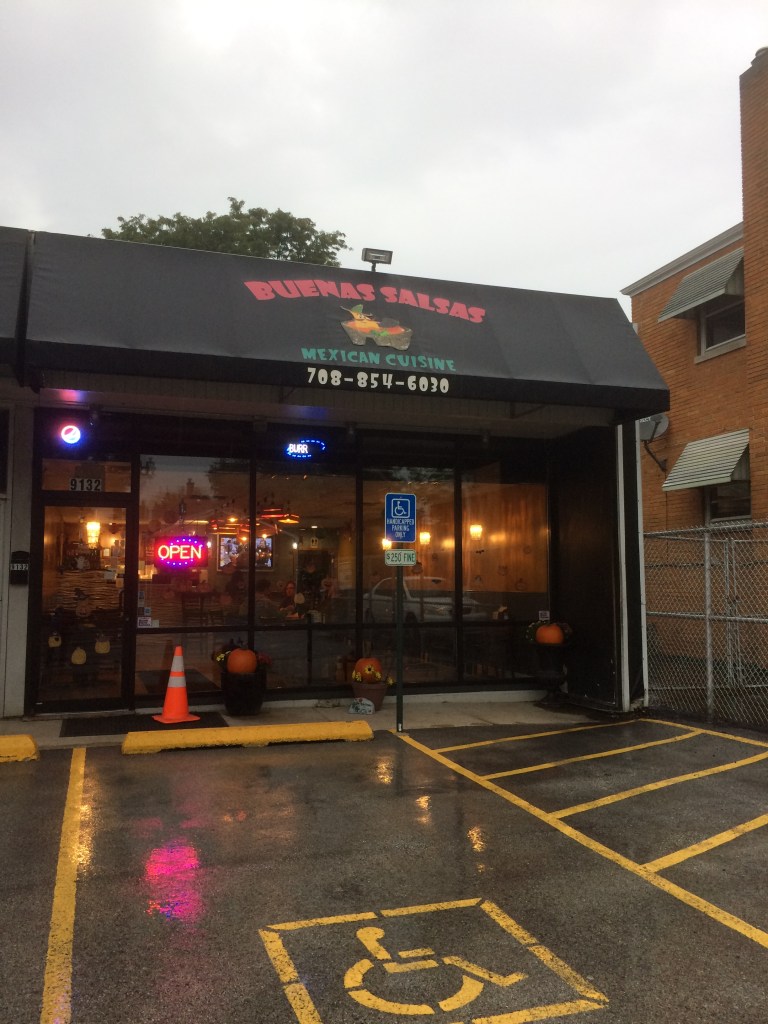 The outside and inside of Buenas Salsas