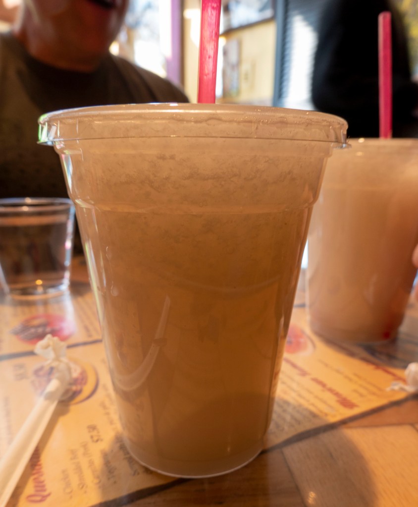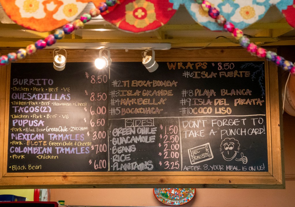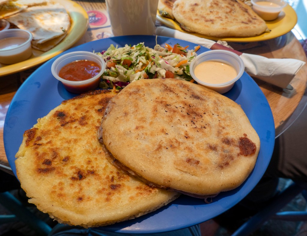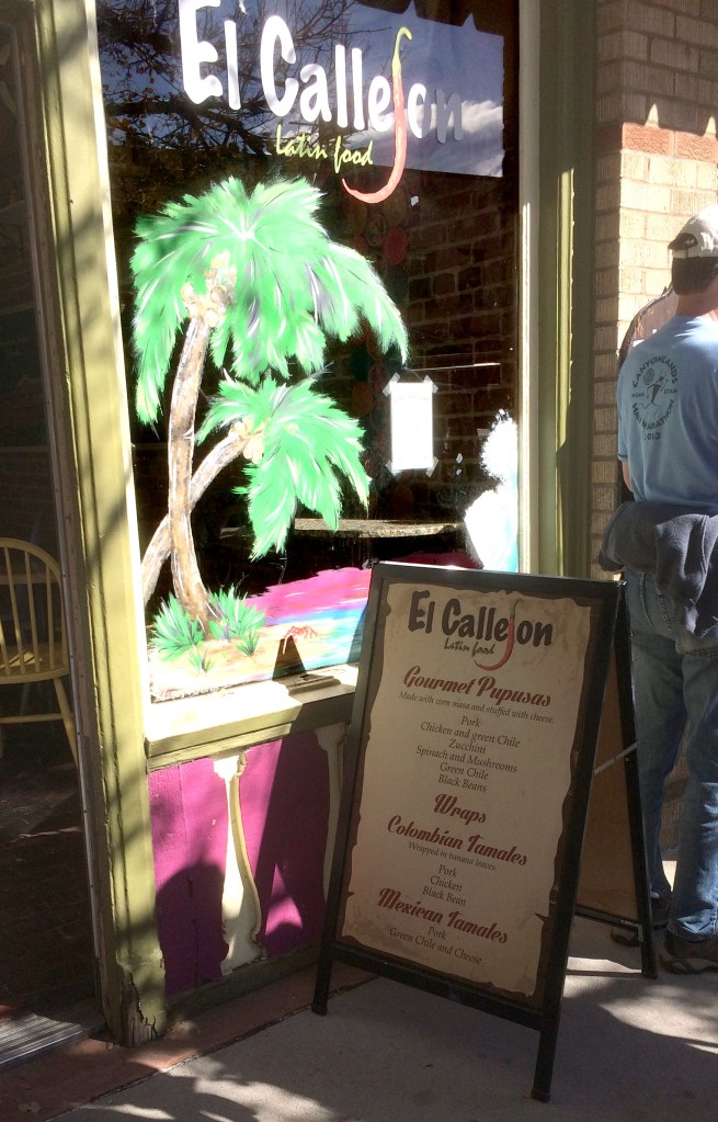 We wanted to go to a restaurant that we hadn’t been to before. We decided to go to Callejon in Golden. It is a very small restuarant with seating outside. We arrived after lunch so we were able to get a small table inside. We were told that Callejon specializes in Columbian food. For such a small space, the menu was quite extensive. The choices were almost overwhelming. However, Callejon had pupusas on the menu. They were labeled as gourmet pupusas. How could I resist! There was also horchata(5)! I couldn’t believe my luck.
