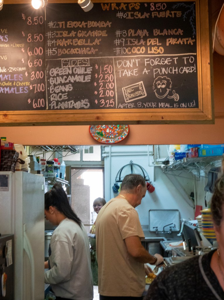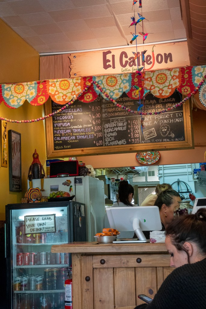 I had the green chile (6.50) and a black bean (6.50) pupusa. Callejon’s pupusas were made with corn masa and stuffed with cheese along with your selections. Meat eaters also had many options like chicken or pork. The pupusas were served with some pico de gallo, red salsa and a chipotle salsa that had a nice kick. They were huge pupusas! Needless to say, I had to bring some food home. It was delicious. Despite the crowds of people in Golden, Callejon felt like an oasis. I think callejon means passageway or alley in Spanish. That is an apt description because this restaurant sure was long and narrow.