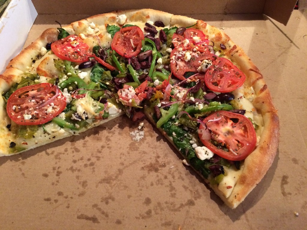 On this particular visit, I ordered the Santorini (14 inches)with green chile (add $1.60 for the entire pizza to be covered with green chile). The Santorini was a delicious combination of Provolone, feta, spinach, Kalamata olives, tomatoes, bell peppers, red onions, basil & Parmesan ($15.85)But I alway need a little green chile to add some zing to my pizzas. I also ordered The Veggie (14 inches) which had mushrooms, green chile, red onions, black olives, bell peppers & tomatoes. ($16.85).