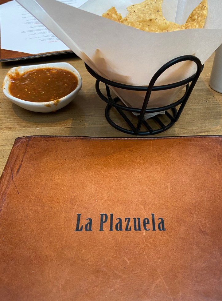 We went there for lunch. Our friend, a native Santa Fean, explained that originally La Plazuela was an outdoor plaza that was eventually covered. The side windows are all hand painted. Wow! There are lots of side windows. I thought it was a nice touch to have chips and salsa first before we even ordered.