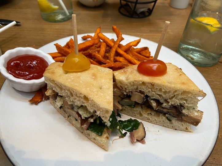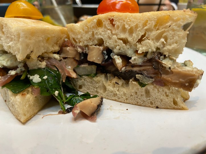 But that was only the beginning of our feast. I had the grilled portobello mushroom sandwich with sweet potato fries (14). The sweet potato fries were not greasy and just lightly salted. The ketchup was tasty, too. I didn’t know that the portobello mushroom would be cut up and combined with pear, spinach, onion, and blue cheese. So I was a little surprised at this variation. This entire assembly was placed on a delicious toasted focaccia bread. It was a wonderful combination of tastes.