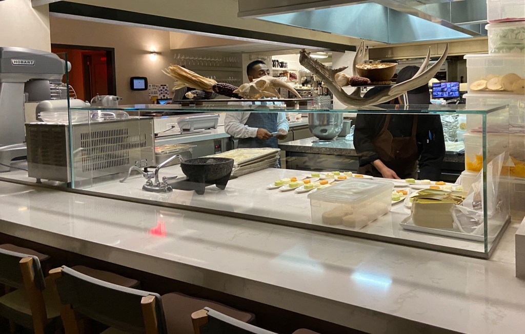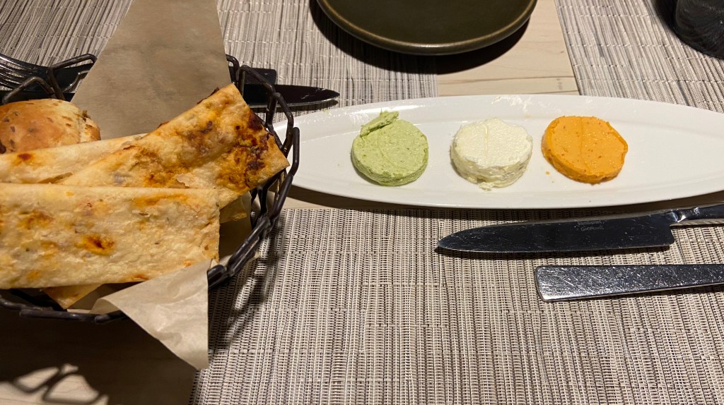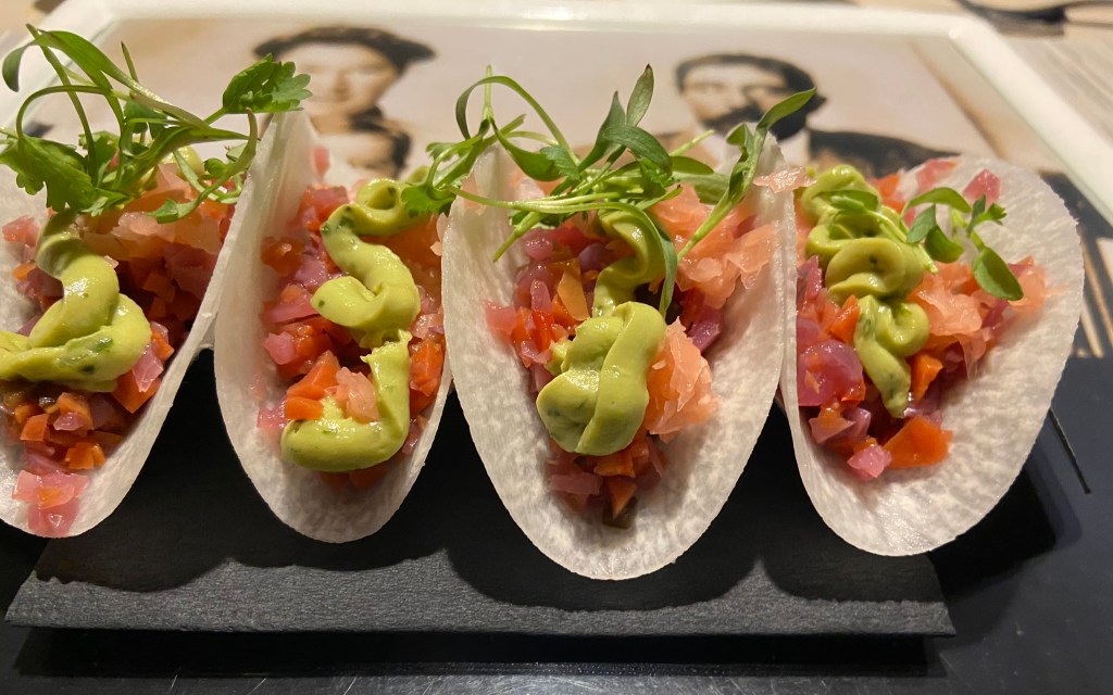 Restaurant Week in Santa Fe has started! We went to Eloísa in the Drury Plaza Hotel. We haven’t been there in years but their special restaurant week menu sounded incredible! For 45 dollars you received a three course dinner menu. There were so many choices that I was glad that there were 3 of us to order different dinner items. We received a complimentary bread basket. Ok, the big, big surprise was the Zuni jicama tacos. I know, who knew. The tacos were made from a fresh jicama wafer filled with escabeche, avocado, cilantro creme with some pickled ginger topped with some fresh micro greens. I have no words to describe this appetizer. I couldn’t believe how good this combination tasted. I would go back to Eloísa just for this appetizer. Wow!