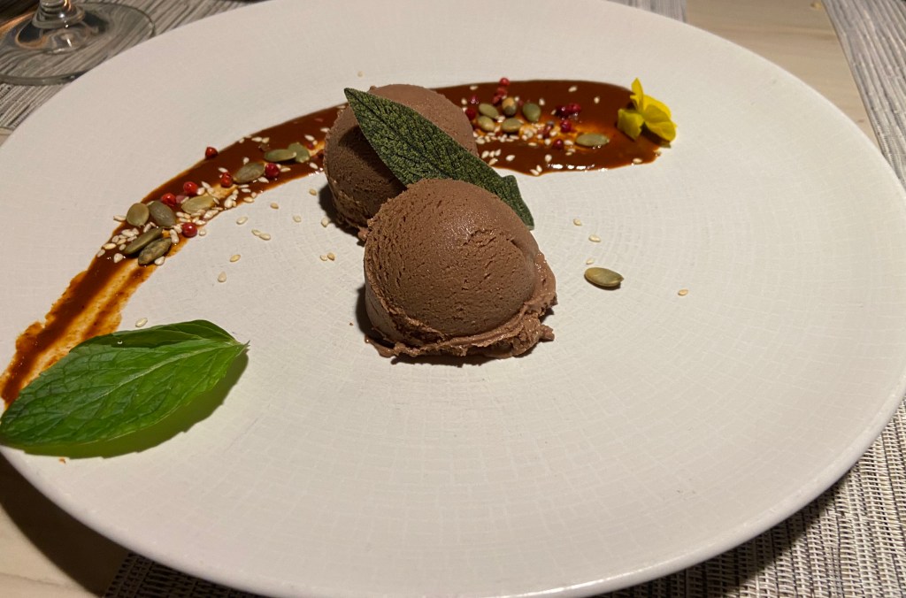 If that wasn’t enough but we had dessert. Our three choices were a caramelizad brioche with popcorn ice cream and apricot sorbet, and apricot panna cotta with incredible caramelizad apricots. Oh, my!!! Our last choice for dessert was a chocolate mole ice cream. Once again, I was glad that there were three of us so we could all taste these delicious goodies.