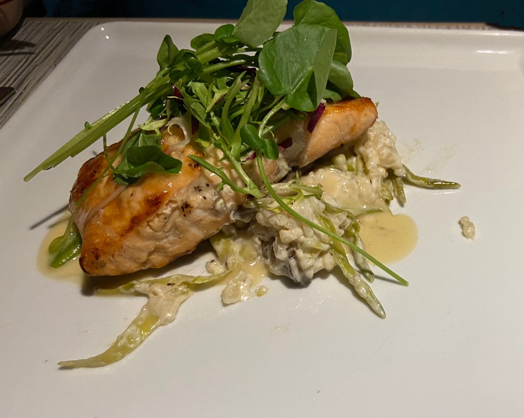 My better half had the grilled salmon that was cooked perfectly. The skin had that wonderful crispy taste, it was accompanied by a shiitake mushroom risotto. It was a beautiful combination of tastes.