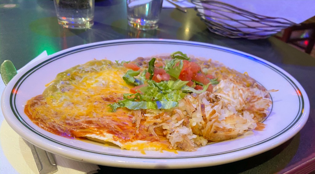 My better half had the Huevos Rancheros which are served all day. There were two fried eggs with yellow corn tortillas. Huevos Rancheros were smothered with red or green chile and topped with cheese. They were accompanied with pinto beans and hash browns(11.45).*