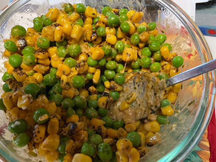The package states that this holiday roast serves 8 people. I’m not sure that there would be enough meatless turk’y for that many people. This dish is also vegan. We had a side of frozen Mexican Corn from Costco. My better half decided to add some frozen peas to the corn. This was an excellent idea. Both vegetables were bright and tasty.