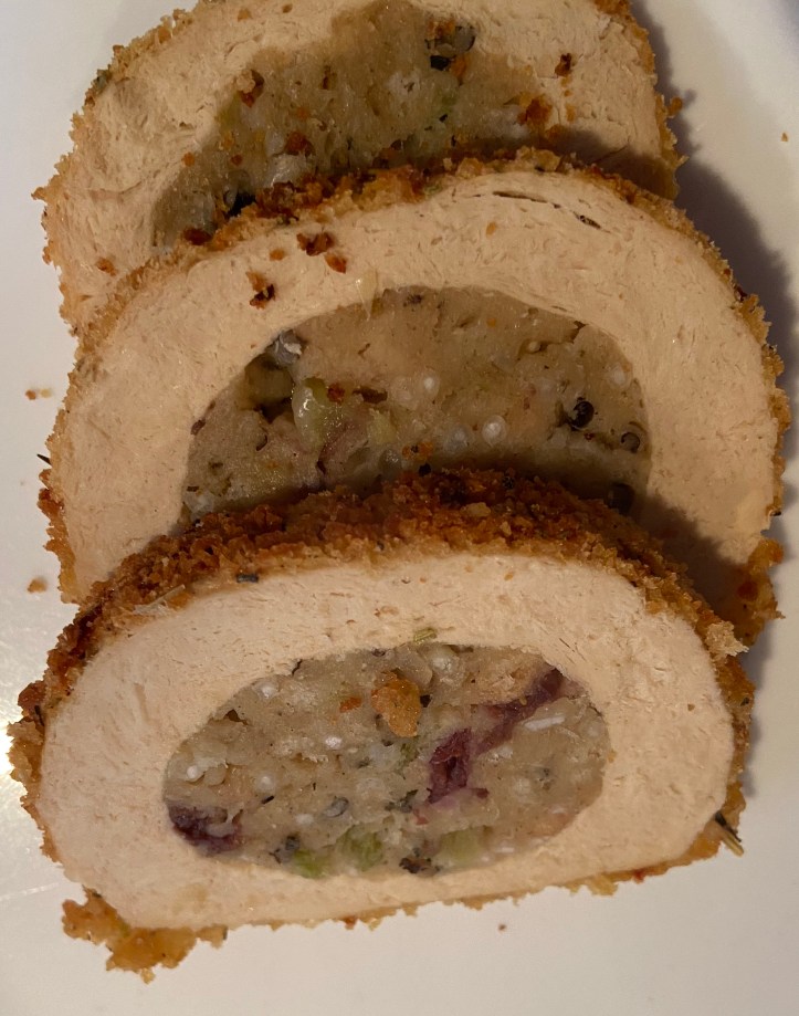 We decided to celebrate the ending of our self-quarantine this week by having a delicious Gardein Holiday Roast, that came from our freezer. Previously, we had enjoyed another holiday roast treat in one of Amanda’s classes at Santa Fe Community College. This Holiday Roast was a meatless turk’y roast stuffed with cranberry and wild rice. The crunchy crust was a delightful treat. There was also some mushroom gravy. Well, it tasted like mushroom to me. Ordinarily, I am not a gravy fan. I never use it. But this gravy wasn’t greasy or meat based so I actually enjoyed it.