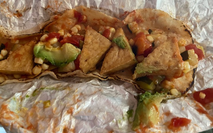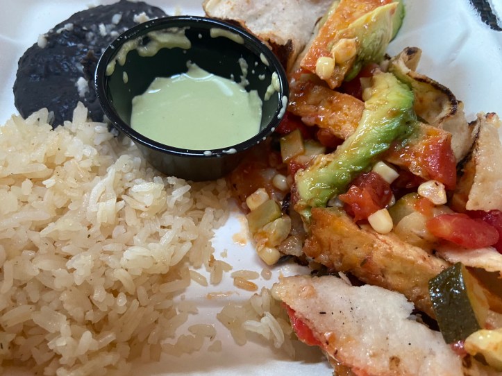 So I ordered a vegetariano taco(16). The take out order comes with two tacos a side of rice and some of the best refried black beans I have ever had in my life. The tacos were soft shelled and nice and warm. Inside was a wonderful combination of fried tofu(which was actually tasty) and some of the freshest vegetables you can ever imagine. The corn was so sweet and tender while the tomatoes were bright. There was some zucchini as well as a good size piece of avocado. Yum! As usual, the show stopper was the crema sauce. Chef Olea is noted for his sauces. All of his sauces are truly incredible.