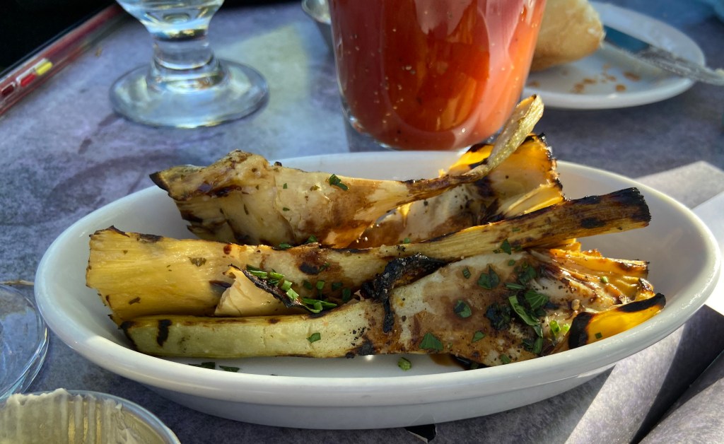 We decided on tapas. El Farol reminds me of being in Spain so that was a fitting choice. We started with drinks. I had the prickly pear margarita(11). It was the perfect drink for a night on the town. The paloma (12)was a tall and tasty cocktail. I liked that it was served in a large glass. I got a taste and really thought it was a good drink. Our friend had a Bloody Mary (8)that had all kinds of olives. This presentation was expertly done. I don’t drink Bloody Marys so I didn’t even want a taste. It did look delicious.