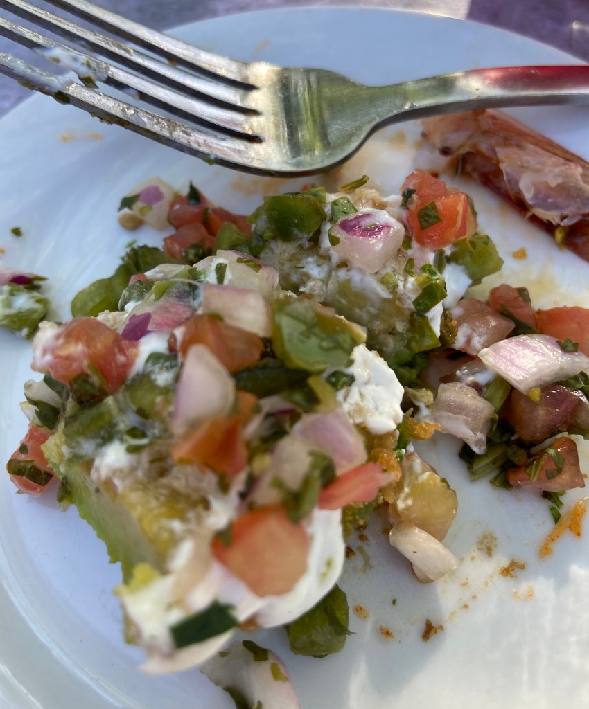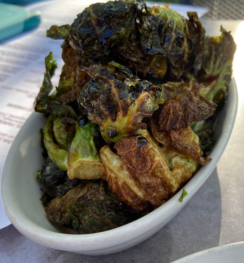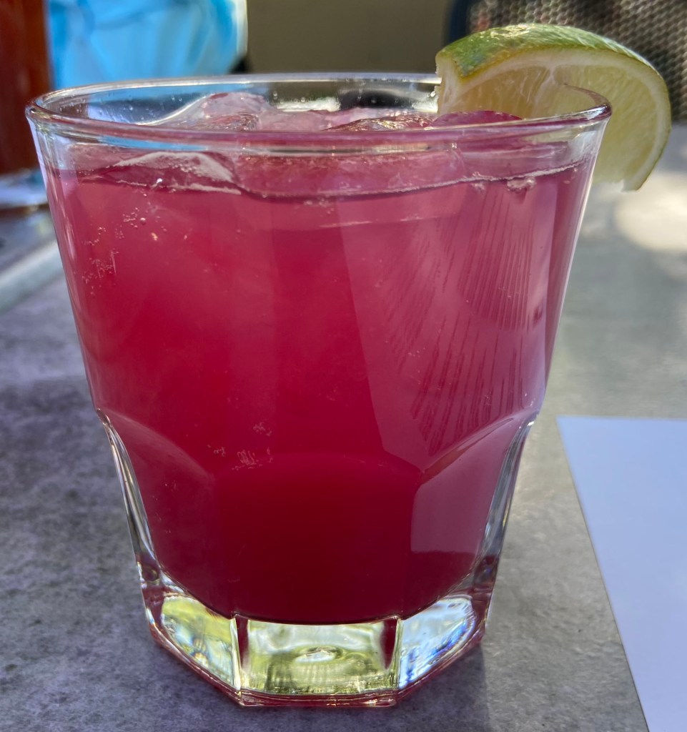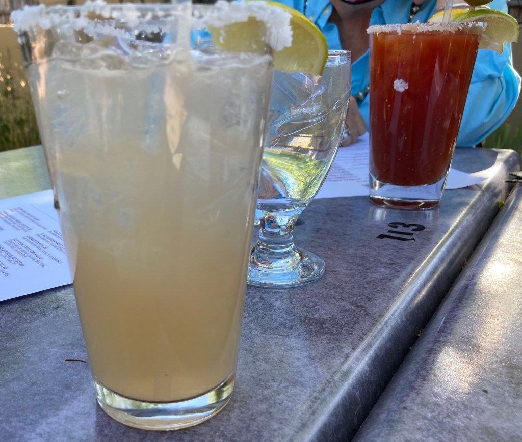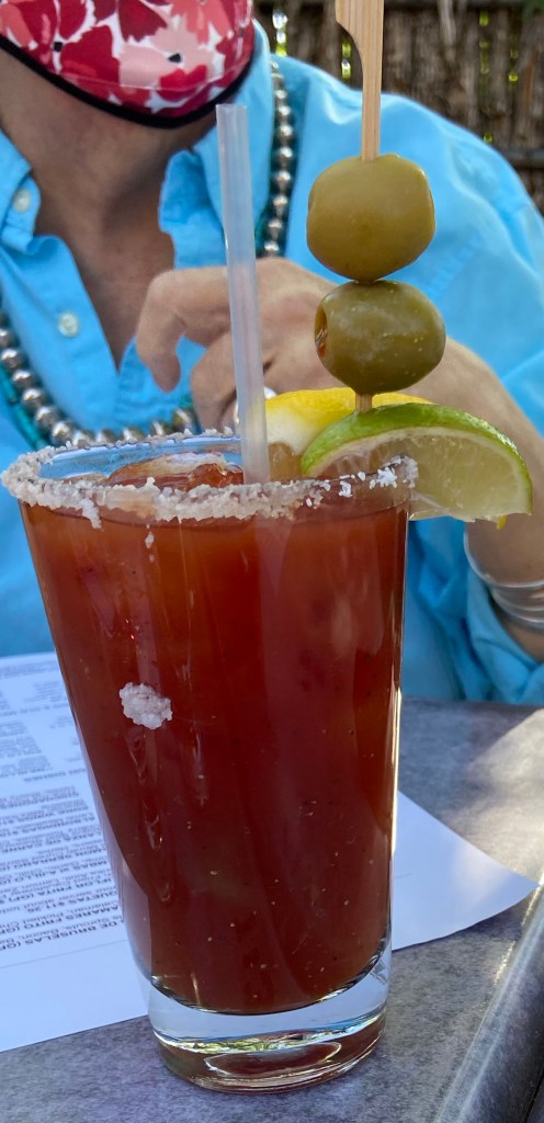 With masks, we went to the patio. We arrived at 5:30ish. It was a beautiful day to be outside in Santa Fe. The patio is a lovely setting. The tall trees made for a wonderful backdrop. It felt like we were on a vacation. Our waitperson was Jose and he did a wonderful job of helping us navigate through the menu.