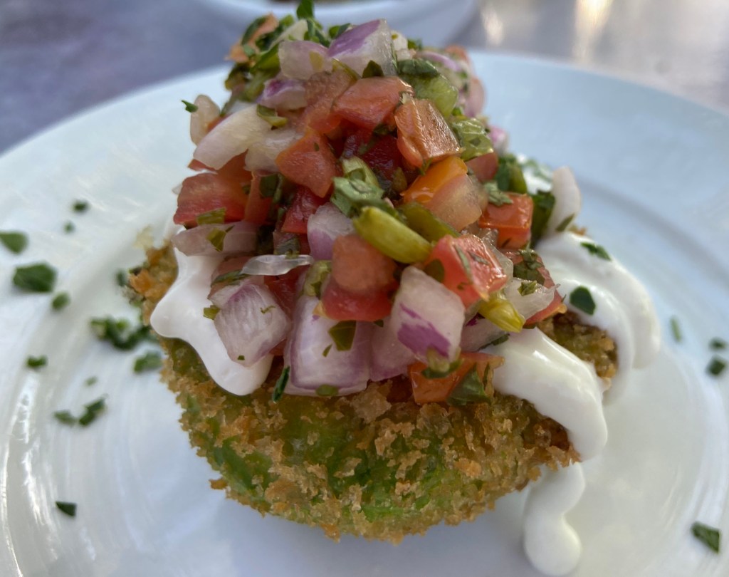 For our Tapas, we started with the Gambas alAjillo (15)( Shrimp, garlic, chili and olive oil)which were gluten free. How can you go wrong with such a delicious combination. The chili flakes on top made the dish. I liked this attention to detail. We also had the Alcachofas (12.50)(marinated & grilled artichokes with a Balsamic reduction) which were also gluten free. Next came the coles de bruselas (10)( Brussels Sprouts without the bacon but with the balsamic reduction. The coliflor fita (12)(flash fried caulifower florets, smoked paprika aioli and lemon zest) which is also gluten free. This was an absolute star. It was so perfectly fried that you would forgot that it was fried. The smoked paprika aioli really added a layer of flavor to this dish. It was fantastic! But the dish that really blew me away was the Aguacate (10.75)(flash fried avocado with pico de gallo and lime Crema). This dish was so good that we had two dishes for the table. It was a complete surprise. I thought it was going to be greasy but it was perfectly cooked. This was a pure delight!