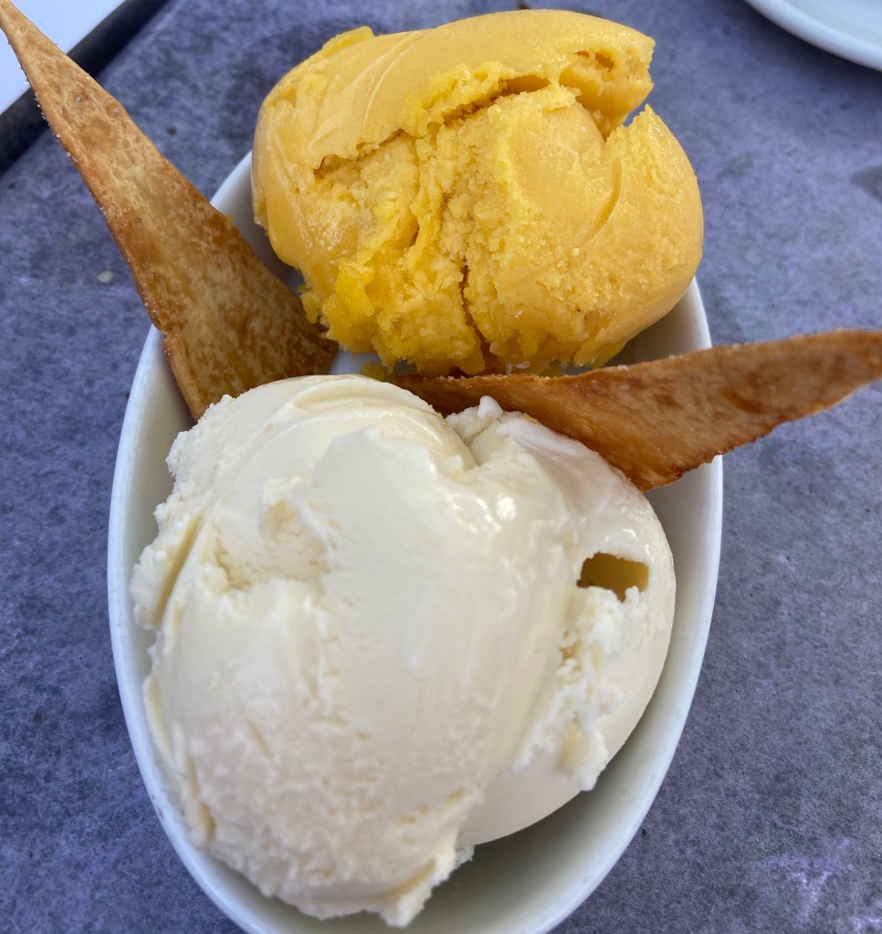I had the helado and sorbete(8) the double version. There was a large scoop of sea salt carmel ice cream with an equal large scoop of Mango sorbet. I couldn’t belive how large the serving size was. I am used to getting ping pong sized scoops. This was fabulous! The mango sorbet really tasted like fresh mango!