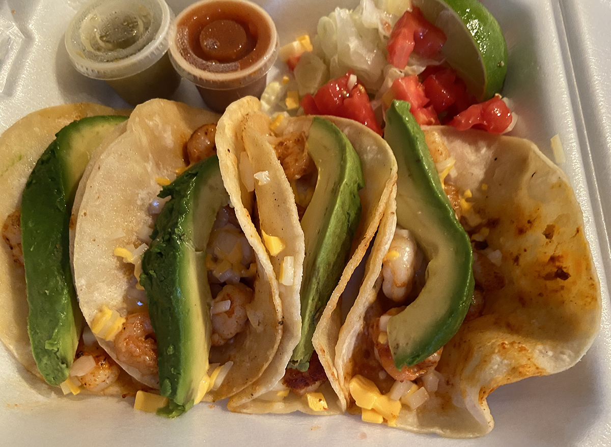 We also ordered the special of the day, Shrimp tacos(12) for 4 shrimp tacos with lettuce, tomato, corn, and the star of the show, the avocado. And yes, there was a great deal of tasty shrimp involved in this taco as well. This dish also came with a tomato and tomatillo sauces.