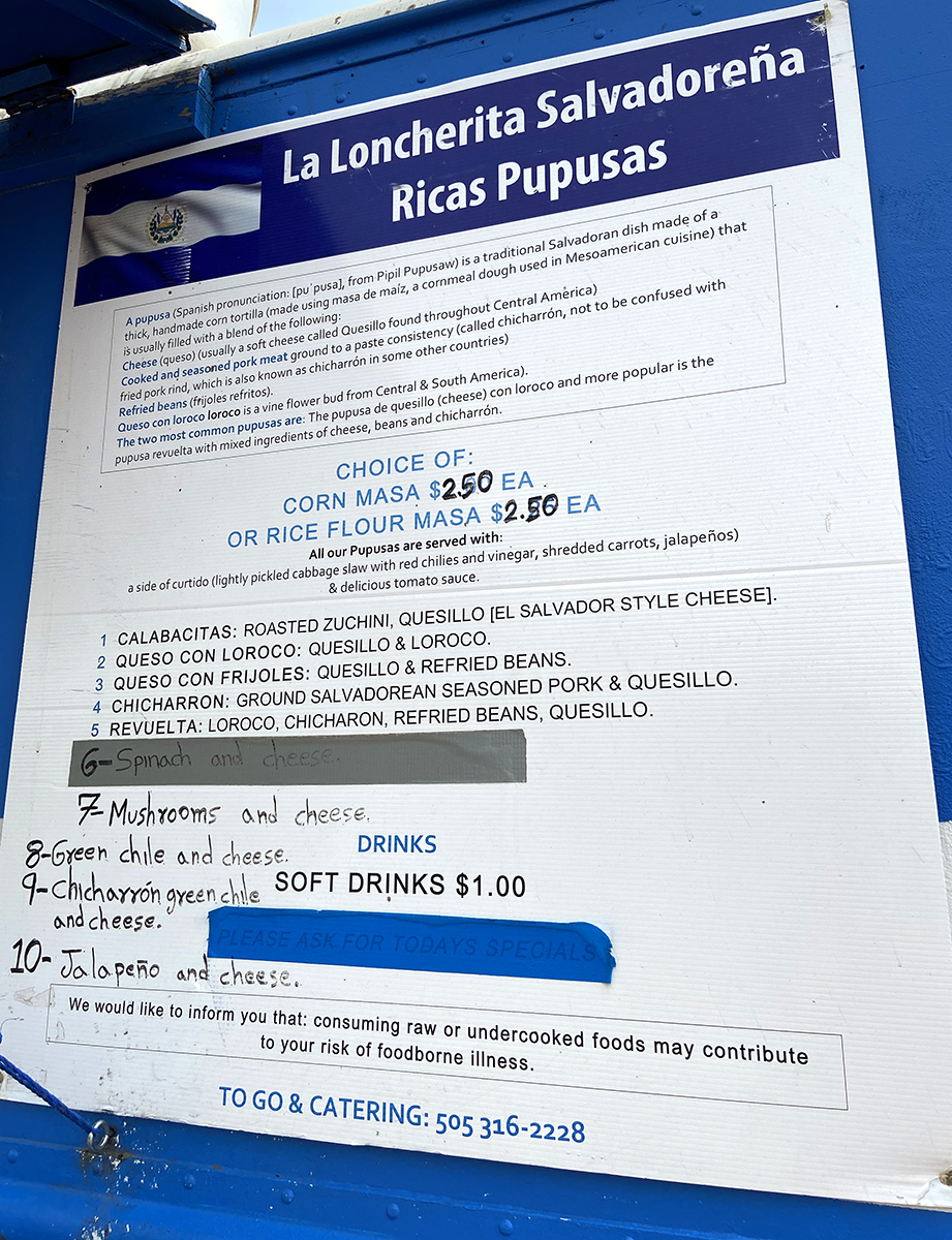 La Loncherita Salvadorena Ricas Pupusas is located at 1741 Llano. They are open from 11-6. Their phone number is 505.316.2228. I know that La Loncherita is closed on Sundays. I’m not sure about if they are open on Mondays. But I do know that they are open from Tuesday-Saturday. I always go when I need an excellent pupusa. This food is truly comfort food for me.