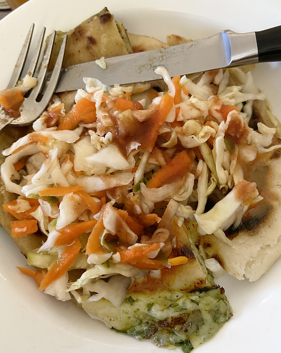 They are back!!! I didn’t see this little food truck for awhile. Ok, they might have been there but I didn’t see them for a long time. When I was running around doing errands, I saw that my favorite pupusa truck was right where it should be on Llano Street. I had missed them. I was so happy to see the little blue truck. The food was even better than what I remembered. We had the Green chile with cheese(2.50) and the Spinach with cheese(2.50). Their curtido ( like a cole slaw) was so tasty and delicious. Of course, we asked to have the spicy tomato sauce instead of the regular tomato sauce. The last photo shows how much of the sauce and curtido you get with your order. We had plenty of both.