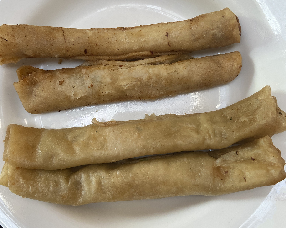 Next we tried the Rolled Tacos (I think they were about the same price as the enchiladas). They, too, were vegan, pea protein with flour tortillas. The filling did reach to the end of the tortilla. That was good. The pea protein looked like a type of meat.