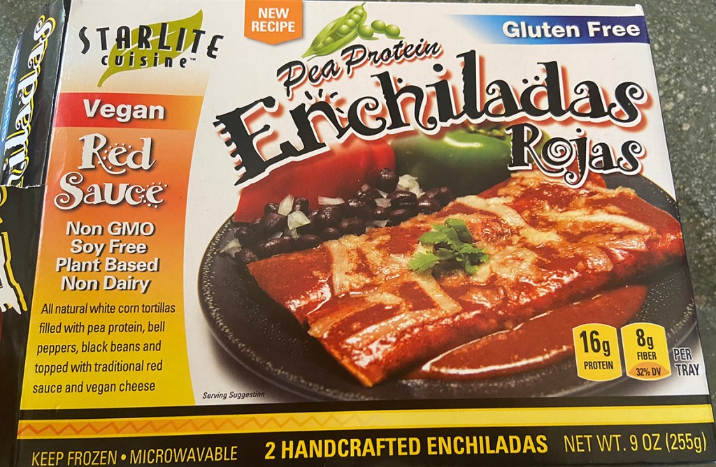 It was ok. But I thought the price was expensive for the Pea Protein Enchiladas Rojas (sale price 5.49, original price was 6.49) There were two enchiladas in a package. As stated on the package, the enchiladas contained pea protein in a white corn tortilla with some bell peppers and black beans. Yes, I picked this product because it was vegan and it had black beans. I am more of a green(verde) sauce but this rojo(red) sauce was good. The vegan cheese was a nice touch but I wasn’t sure where it was. Maybe it just blended into the sauce.
