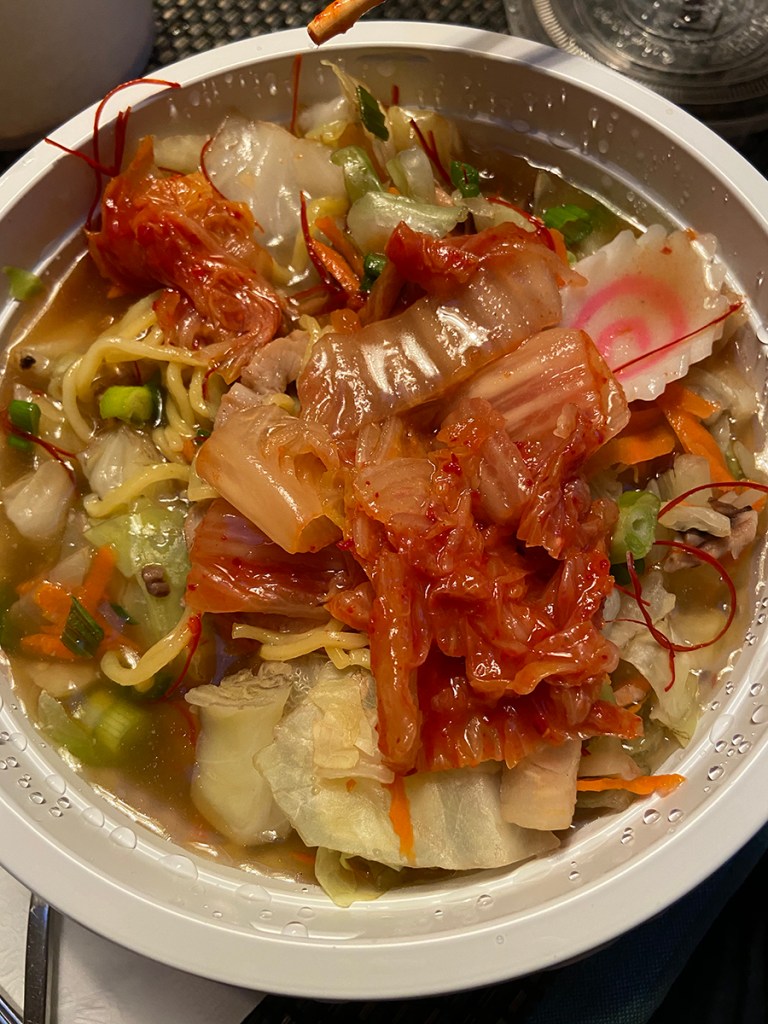 I had the vegetable ramen with the shoyu (fermented soy bean) instead of miso. Shoyu is a little less salty. I think so anyhow and my fingers didn’t swell up so there definitely was less salt. The vegetable ramen(10.95) came with cabbage, fried tofu, red bell peppers and green onions. I ordered the green chile tempura(2.50 extra) just to see what it was like. You get 2 pieces of tempura with an order.There were no peas or carrots so I thought I would give the tempura a shot. It was wonderful. I really didn’t need it but it was a nice choice. Later, I added some carrots which you will see made the very colorful dish even more so. The vegetable shoyu was filled with all kinds of spices and was incredible. Since it took awhile to get home I needed to reheat this dish just a little bit. The containers had kept the ramen really warm. Nice packaging. The green chile tempura was also packaged separately. Thank you!