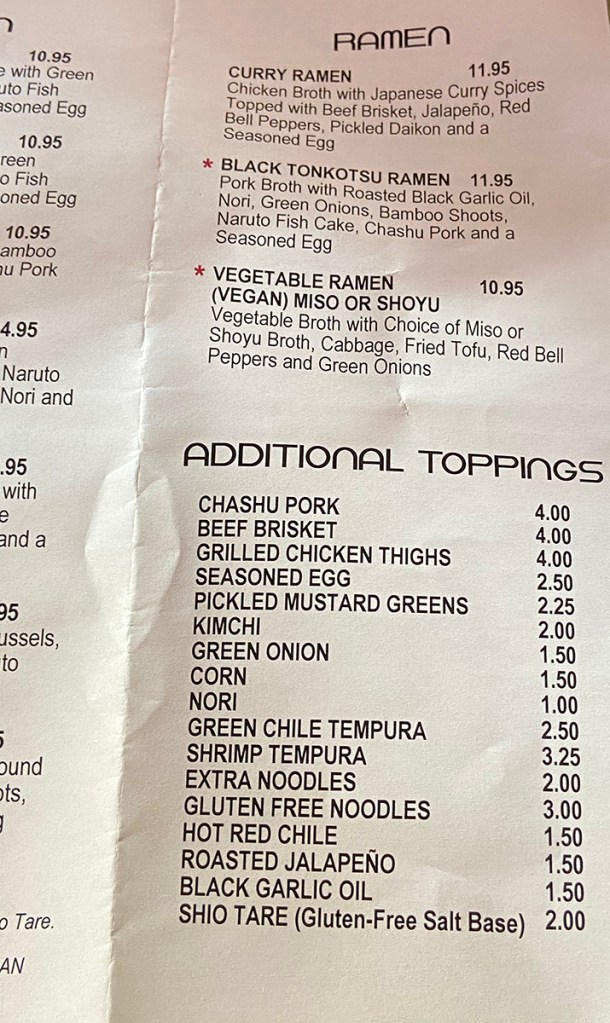 It is ramen weather. I have wanted to check out this place since I read a review by Alex De Vore in the Santa Fe Reporter in August. I need it to be cold for ramen weather. First of all this isn’t the cheap stuff I used to live on in college and after. This ramen has high quality noodles and ingredients like real vegetables. It doesn’t come with a flavor package filled with salt and artificial flavoring. Just saying…