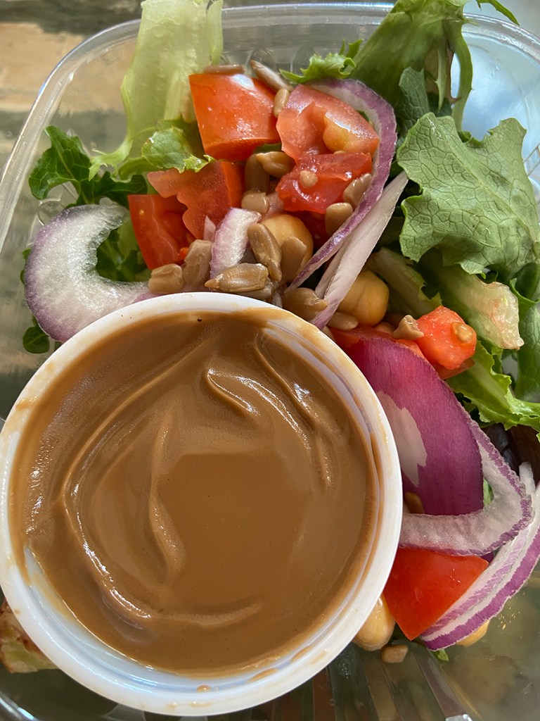 I have always wanted to go to Back Road Pizza. I finally got a taste of their wonderful pizza. It was so easy to order on their online menu. We ordered a small side salad, a large Greek pizza, and a pint of green chile ice cream. What a haul! The cool part is that you text Backroad Pizza when you arrive and then they place the order on that black holder with a rack.