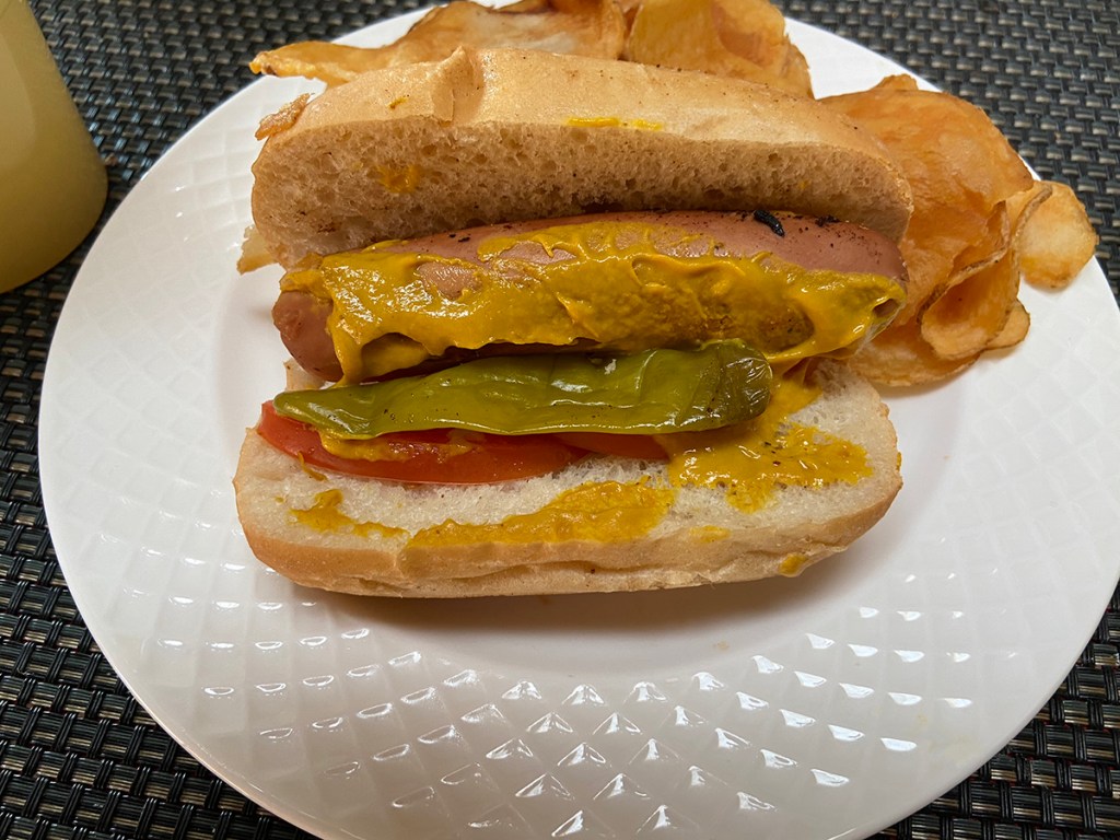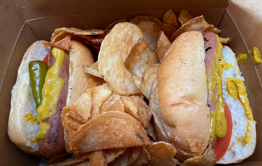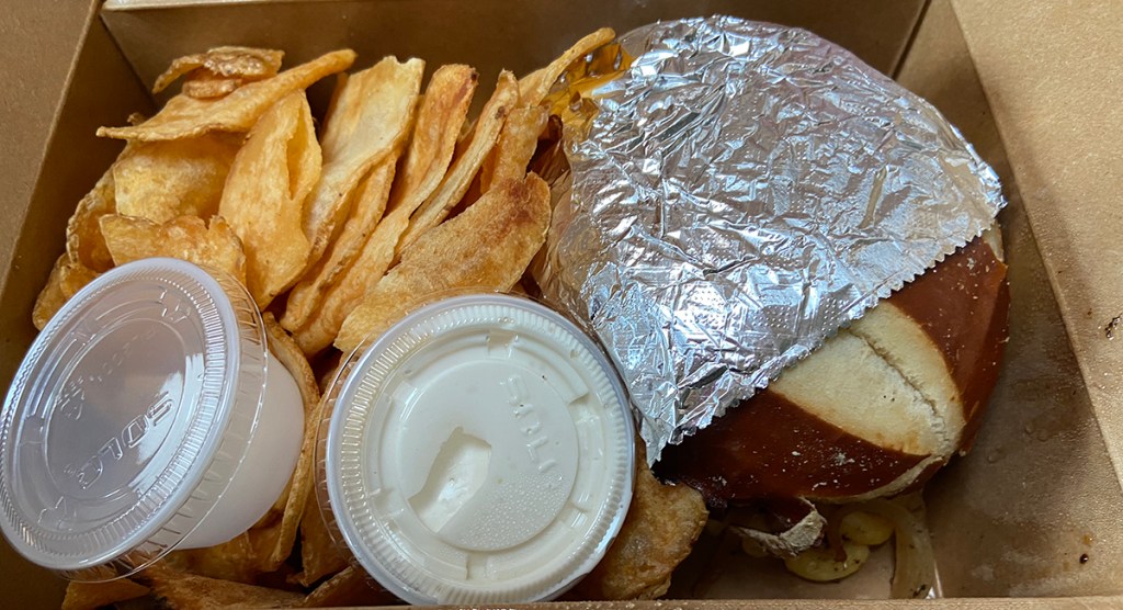 We ordered the Chicago style hotdog and the mac and cheese burger. One of the foods that I miss the most are hot dogs. Yes, I find that I can satisfy that craving with a carrot dog or a tofu dog. It works. I also miss a Chicago style hot dog. It is a comfort food for me. A hotdog covered with onions, mustard, fluorescent green relish, a tomato slice, a pickle, and of course a sport pepper on a sesame seed bun. Yes, that is a Chicago dog. At Green Gene, the Chicago style dog (10) comes with mustard, a slice of tomato, and a beautiful sport pepper on a bun. There were two small hot dogs which I didn’t expect. This made eating them a lot easier. The chip were house made. Green Gene’s gave us salt to put on our chips. I didn’t need the salt. The chips were wonderfully warm. The hot dog was very tasty on the bun. I loved it!! I added pickles and onion when I got home but that was not a big deal. I was so impressed with my meal that I forgot that it was vegan.