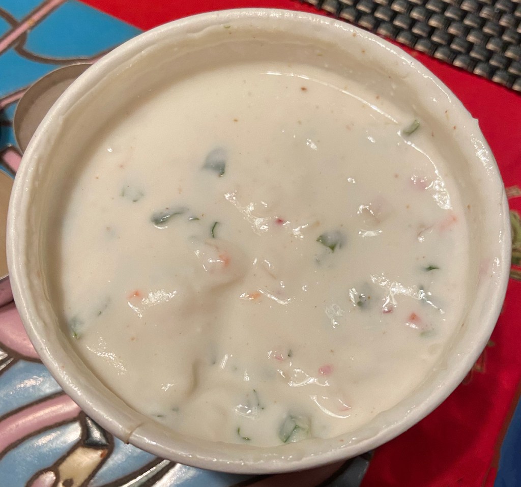 Raitha is one of my favorite items on the menu. It is a spiced yogurt with carrot and cucumber bits. At Paper Dosa, you receive an 8oz portion for 4.50. We are still working on ours.