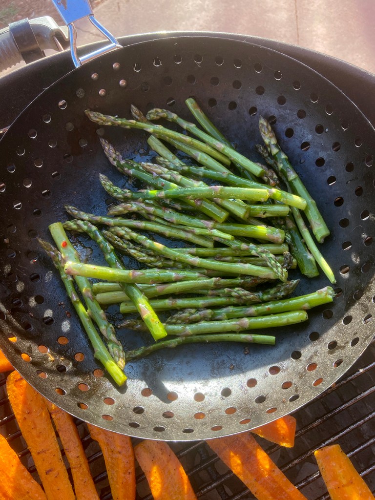 Since it is the beginning of asparagus season, it must be because we found some at Sprouts. I put some on in my pan and grilled them, too. I marinated the spears in salad dressing. I like Italian so there ya go. If I do say so, this was a rare treat. The spears were not tough or stringy. The bottom end of the spear was broken off but it was basically a no fuss prep.