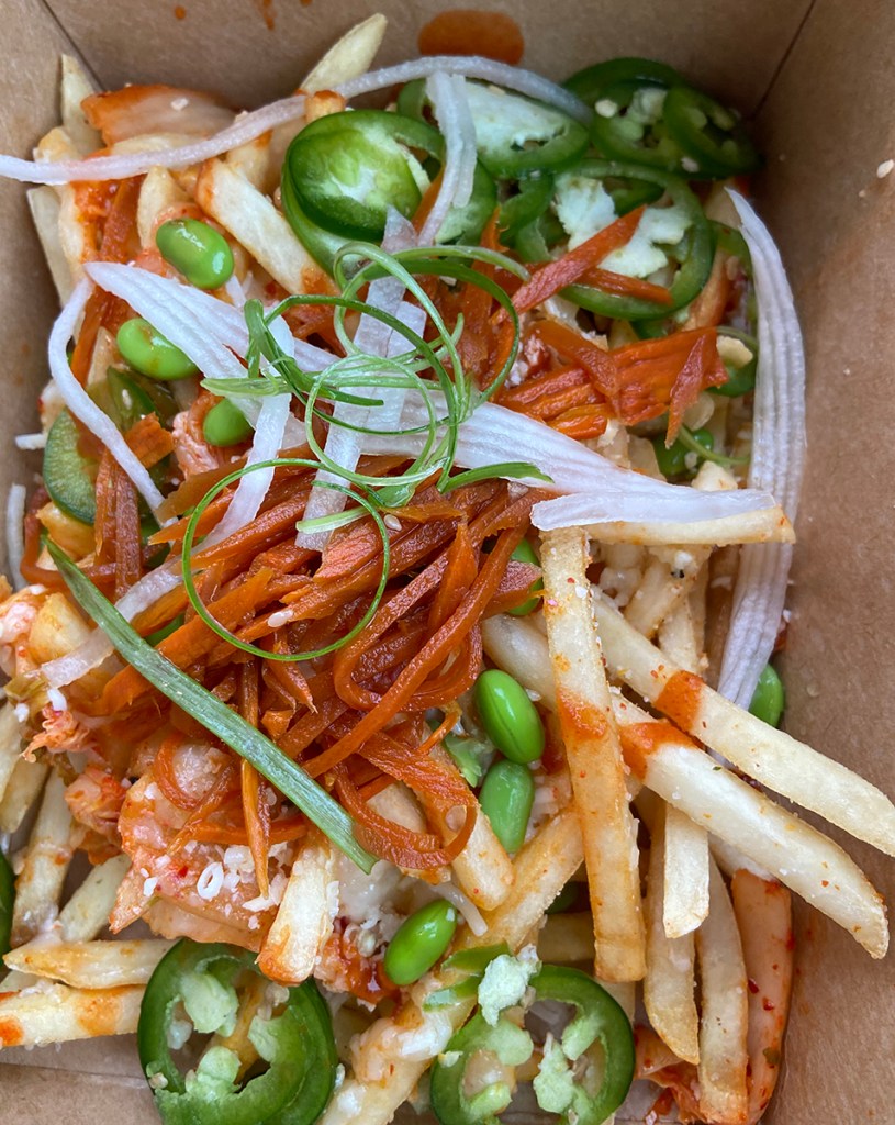 On Friday, we were in town and decided to stop by for some kimchi fries to take-out. I started eating mine in the car. It was incredible! Yes, hot food does make a difference.