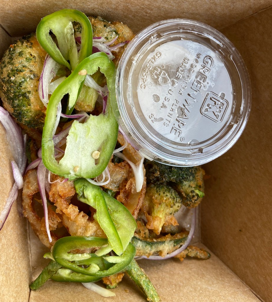 The vegetable tempura was lightly battered. Our electronic device didn’t reach all the way out to the parking lot so it wasn’t as hot as I would have liked. There were some pieces of broccoli, zuchini, beans, peppers with some onions. No worries, we were eating take-out. So we heated both items when we got home. The Kimchi fries were the star. There was enough kimchi to make this dish interesting.