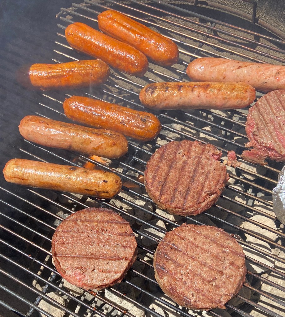 Deciding that my frozen Impossible Burgers from Costco(13.99)or at Sprouts (16.99) was the route to take. I grilled some Impossible Burgers, Beyond Meat Italian Sausages, Lightlife Brats, avocados, pineapple, and a sweet onion.