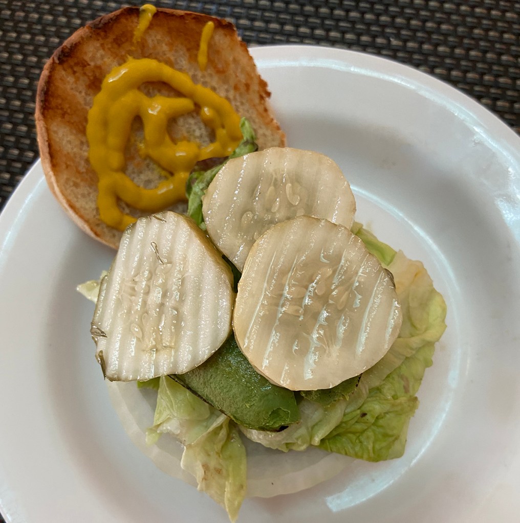 This is my Impossible Burger, the final product. I put onion, lettuce, avocado, pickles, mustard, and Tabasco Ketchup on my Impossible Burger. Yes, there is a burger under all of that.
