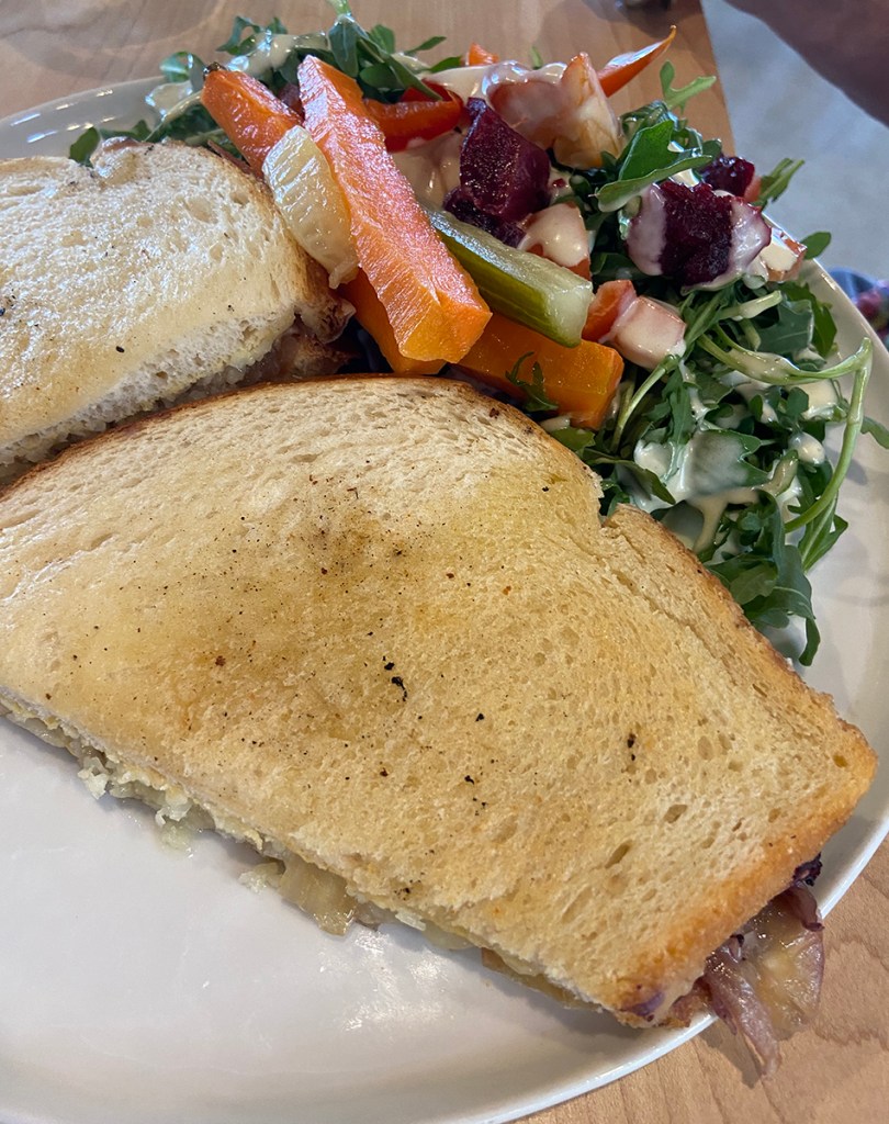 The grilled cheese sandwich(13) didn’t look grilled, maybe it’s just me. The cheese was gruyere and fontal with some nicely caramelized onion with a wholegrain mustard with house-made sourdough multigrain bread served with either fries or a side salad. The grilled cheese also came with some pickled vegetables.
