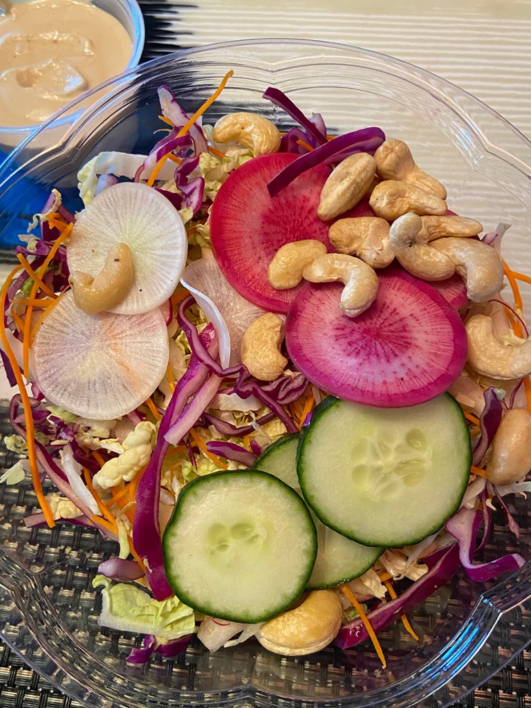 We had an beautiful Asian Vegetable salad made with Napa Cabbage, pickled radish cucumber, and roasted cashews that was served with a side of Sesame Ginger dressing. This was vegan and also gluten free. It tasted as good as it looked.