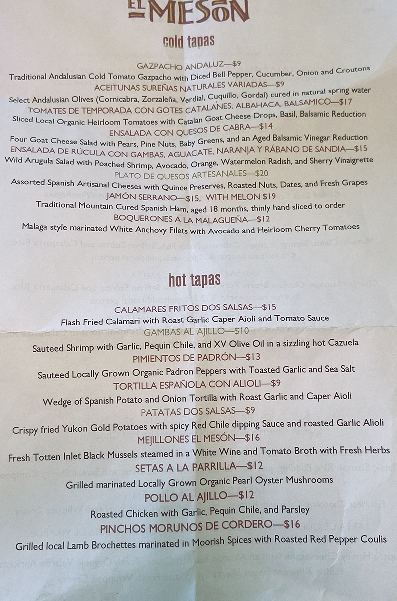 What a delicious way to start a meal. We were in the process of deciding what tapas we would choose. As you can see there were many choices for non-meat eaters.