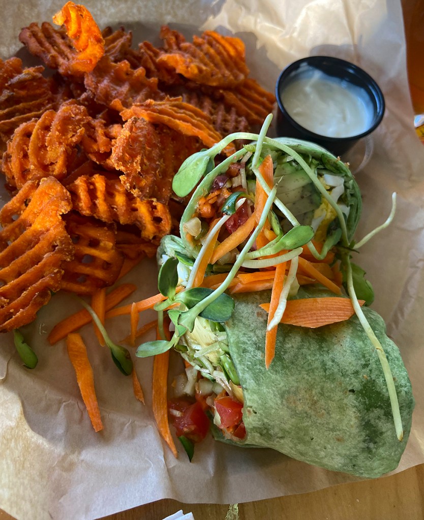 The sweet potato waffle fries were perfectly cooked. The wrap and fries came with blue cheese dressing on the side. Did you see all those carrot slivers on top as well as the sprouts? It was as beautiful as it was tasty.