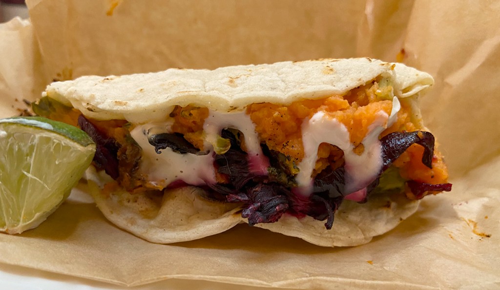 I also had the sweet potato Taco (3)with Brussels sprouts, which were whole. kale, garlic, cotija cheese, hibiscus caramelized onion and chile arbol(a small Mexican pepper that packs a punch). The sweet potato was nice and creamy.