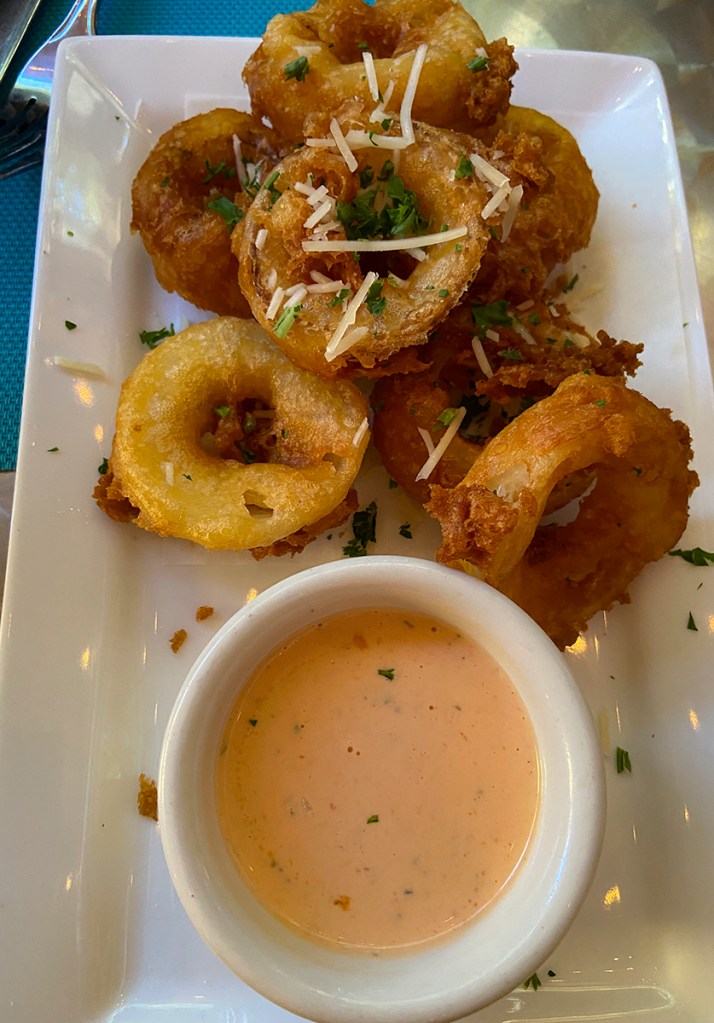 To start, we had the famous onion rings(8) with an incredible house made sauce. There was a nice tang of heat to go with that delicious sauce. The onion rings were perfectly cooked and were not at all greasy. This was a rare treat because now during the pandemic, many restaurants have taken this item off of their menu. I have no idea why? I think it is a work intensive item.