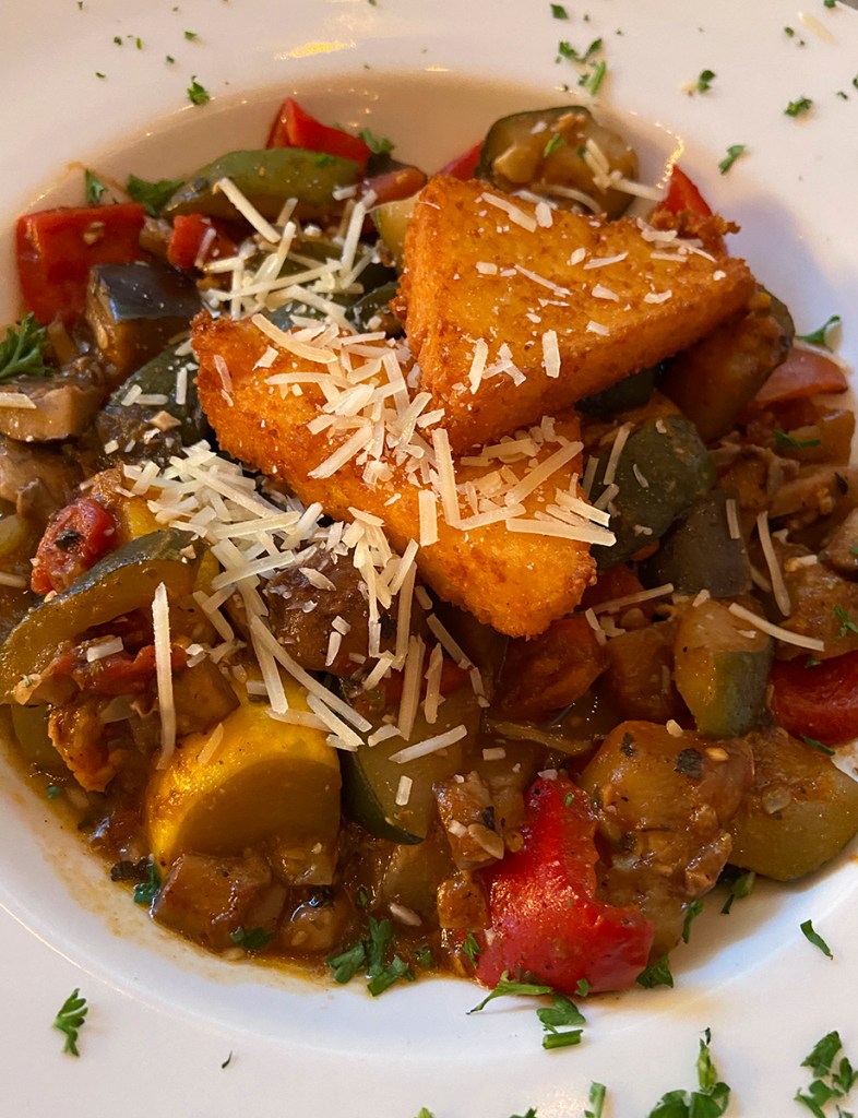 Next is a photo of my entree, the rustic vegetable ratatouille(25). This was indeed a harvest feast. All of the vegetables were perfectly cooked and seasoned. Even the eggplant was wonderful. I’m not a fan. There were all kinds of interesting vegetables like red peppers, mushrooms, zucchini, summer squash, and tomatoes. The seasoning was divine and made the vegetables sing. The vegetables were outstanding. The polenta wedges just added the right amount of heft to the dish. They balanced the vegetables. Also adding to this dish was the Parmesan Cheese. Wow! that addition really made this dish pop. As did the presentation of the sprinkled parsley. It was a beautiful dish to behold and and incredible dinner. I was in heaven. What a meal!!! I didn’t need any wine, my iced tea was a perfect pairing with this fall extravaganza.