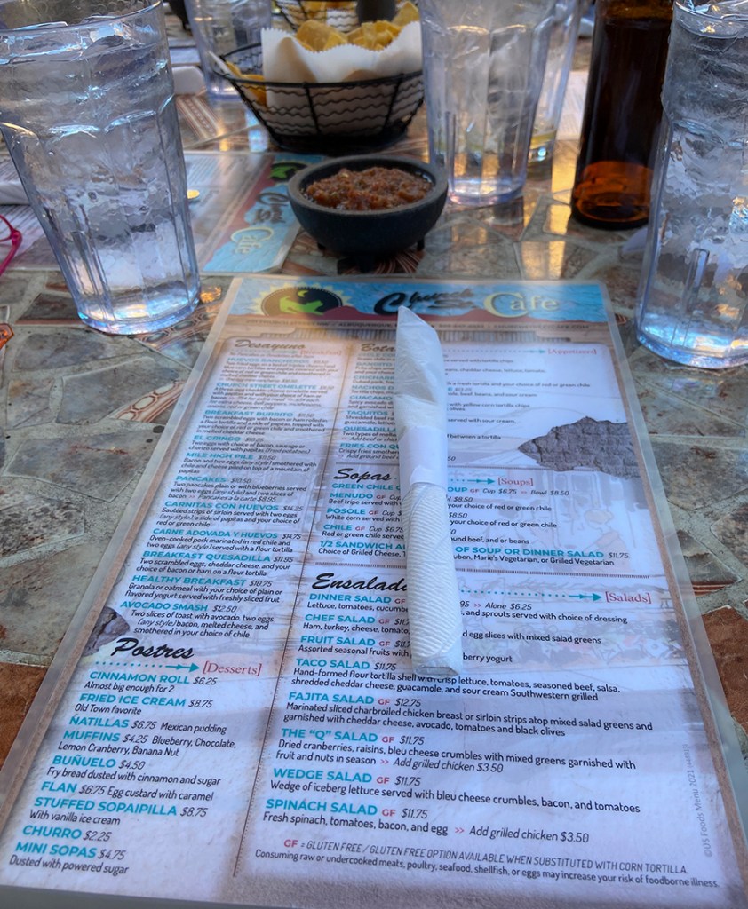 I read up about this place because it had been years since I have walked around Old Town in Albuquerque. Because of parking issues, I always make targeted runs like going to the Candy Lady, which is also in the plaza area. As you can see from the front, I thought this place was small. It isn’t. It is a large space with a beautiful courtyard in the back. Who knew? Since we have been lucky to still have incredibly warm weather, we sat out back in the beautiful, large patio.