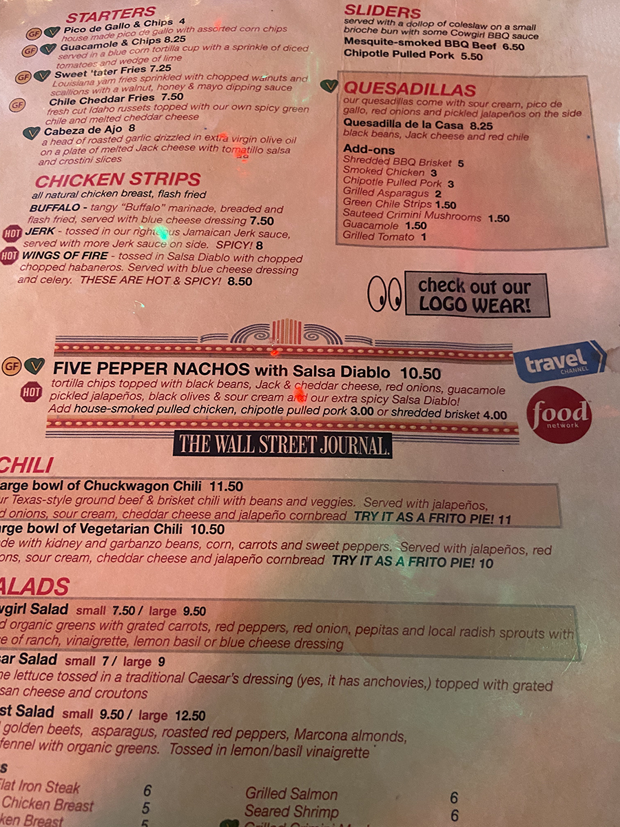 Since we hadn’t seen our friends in a long time, it took us a while to figure out what we were going to eat. Our server was very patient and helpful. There wasn’t a crowd so we didn’t have to hurry. I would recommend that you arrive for lunch after the large lunch crowd 11:30-1pm leaves. We were able to get a booth on the heated porch after the lunch crowd left. There are more vegetarian and vegan food options than previously offered. All good! One of our friends was even able to get a gluten free bun for his burger. As always, the service and the food are top notch. Cowgirl offers online ordering, take-out, daily food specials, daily drink specials. Happy Hour is from 3-6pm Monday-Friday.