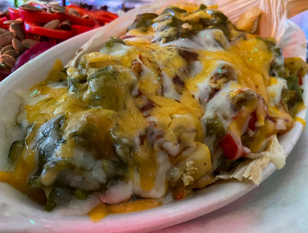 This is the gorgeous Christmas Tamale Pie! The tamale pie(11) was corn masa layered with calabacitas. I love squash with corn. Just look at that plate! The side salad also was a beautiful presentation of a salad. It tasted as good as it looked. The red bell peppers were a pleasant surprise. The pepitas and red onions with tiny sliced carrots just added to the flavor and also the taste. What a side salad! The tamale pie was topped with Monterrey Jack and Cheddar cheese. It was a delightful combination of my favorite cheeses. The combination was a match made in heaven or in this case the Cowgirl’s kitchen.